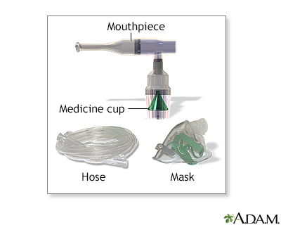Nebulizer - how to use; Asthma - how to use a nebulizer; COPD - how to use a nebulizer; Wheezing - nebulizer; Reactive airway disease - nebulizer; COPD - nebulizer; Chronic bronchitis - nebulizer; Emphysema - nebulizer; Chronic obstructive pulmonary disease - nebulizer; Cystic fibrosis - nebulizerA nebulizer is a small machine that turns liquid medicine into a mist that can be easily inhaled. You sit with the machine and breathe in the medicine through a connected mouthpiece or facemask. This allows the medicine to enter the lungs directly.