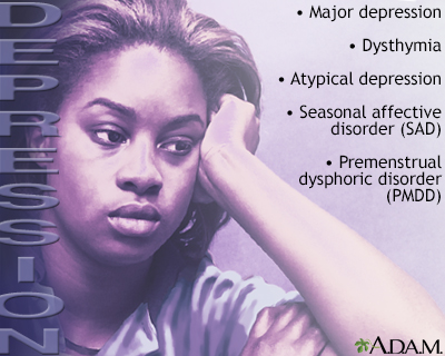 Depression is a mood disorder in which overwhelming feelings of sadness, loss of pleasure, guilt, and hopelessness interfere with daily life. People with depression also suffer from sleep problems, difficulty concentrating, fatigue and low energy, changes in appetite, and recurring thoughts of death or suicide.