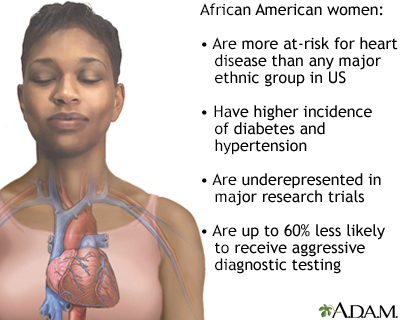 African Americans have the highest risk of heart disease in part due to their high rates of severe high blood pressure as well as diabetes and obesity.