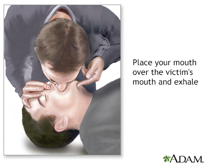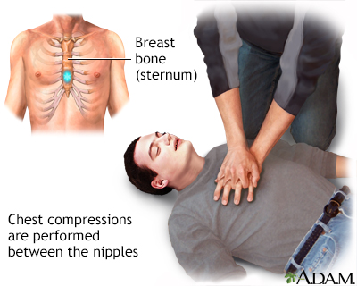 Cardiopulmonary resuscitation - adult; Rescue breathing and chest compressions - adult; Resuscitation - cardiopulmonary - adult; Cardiopulmonary resuscitation - child 9 years and older; Rescue breathing and chest compressions - child 9 years and older; Resuscitation - cardiopulmonary - child 9 years and olderCPR stands for cardiopulmonary resuscitation. It is a lifesaving procedure that is done when someone's breathing or heartbeat has stopped. This may happen after an electric shock, drowning, or heart attack. CPR involves: