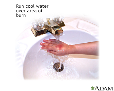 - Run cool water over the area of the burn or soak it in a cool water bath (not ice water). Keep the area under water for at least 5 to 30 minutes. A clean, cold, wet towel will help reduce pain.