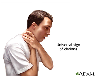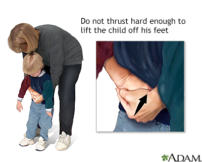 Abdominal thrusts - adult or child over 1 year; Heimlich maneuver - adult or child over 1 year; Choking - back blows - adult or child over 1 yearChoking is when someone is having a very hard time breathing because food, a toy, or other object is blocking the throat or windpipe (airway).