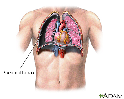 Air around the lung; Air outside the lung; Pneumothorax dropped lung; Spontaneous pneumothoraxA collapsed lung occurs when air escapes from the lung. The air then can fill the space outside of the lung between the lung and chest wall. This buildup of air puts pressure on the lung, so it cannot expand as much as it normally does when you take a breath.