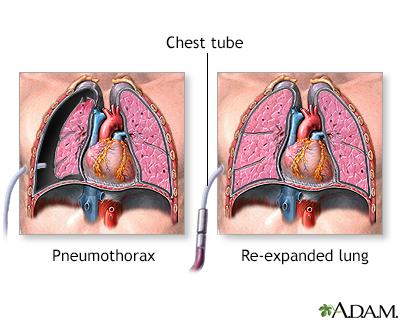 If you have a large pneumothorax, a chest tube will be placed between the ribs into the space around the lungs to help drain the air and allow the lung to re-expand. The chest tube may be left in place for several days and you may need to stay in the hospital. If a small chest tube or flutter valve is used, you may be able to go home. You will need to return to the hospital to have the tube or valve removed.