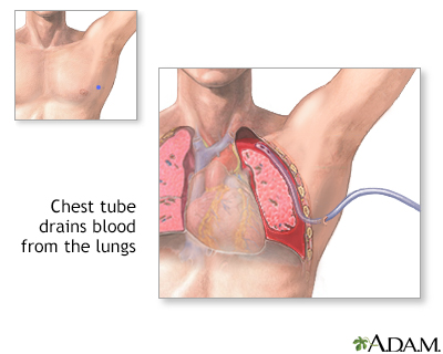 A chest tube is a hollow, flexible tube placed into the chest. It acts as a drain. Chest tubes drain blood, fluid, or air from around your lungs, he...