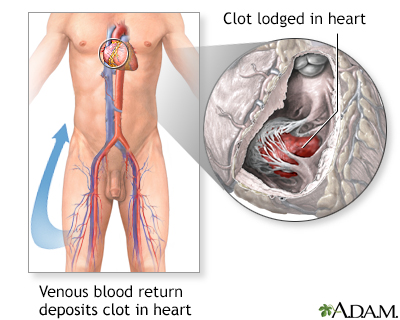 DVT is most common in adults over age 60. But it can occur at any age. When a clot breaks off and moves through the bloodstream, it is called an embolism. An embolism can get stuck in the blood vessels in the brain, lungs, heart, or another area, leading to severe damage.