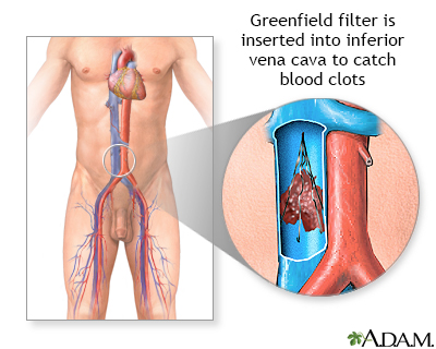 - Placing a filter in the body's largest vein to prevent blood clots from traveling to the lungs
