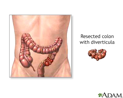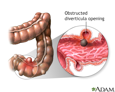 Diverticula are small, bulging sacs or pouches that form on the inner wall of the intestine. Diverticulitis occurs when these pouches become inflamed or infected. Most often, these pouches are in the lower part of the large intestine (colon).