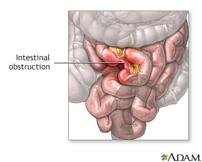Paralytic ileus; Intestinal volvulus; Bowel obstruction; Ileus; Pseudo-obstruction - intestinal; Colonic ileus; Small bowel obstructionIntestinal obstruction is a partial or complete blockage of the bowel. The contents of the intestine cannot pass through it.