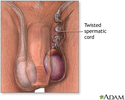 Torsion of the testis; Testicular ischemia; Testicular twistingTesticular torsion is twisting of the spermatic cord, which supports the testes in the scrotum. When this occurs, the blood supply is cut off to the testicles and nearby tissue in the scrotum. This may cause permanent damage to the testicle.