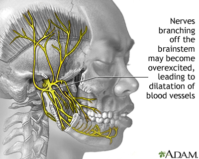 Headache - migraine; Vascular headache - migraineA migraine is a type of headache. It may occur with symptoms such as nausea, vomiting, or sensitivity to light and sound. In most people, a throbbing pain is felt only on one side of the head.