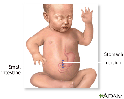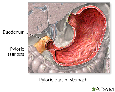 Congenital hypertrophic pyloric stenosis; Infantile hypertrophic pyloric stenosis; Gastric outlet obstruction; Vomiting - pyloric stenosisPyloric stenosis is a narrowing of the opening from the stomach into the small intestine. This is called the pylorus. This article describes the condition in infants.