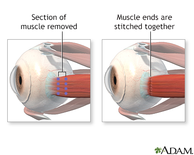 Eye muscle surgery may be needed if the eyes still do not move correctly. Different muscles in the eye will be made stronger or weaker. To strengthen a muscle, it is removed from the eye, shortened, then reattached. To weaken a muscle, it is removed from the eye and reattached further toward the back of the eye. Often in adults, an adjustable suture method is used so that the final adjustment of the position of the weakened muscle is made with the person awake and looking at a target. This has been shown to be more accurate.