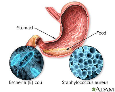 Food poisoning occurs when you swallow food or water that contains bacteria, parasites, viruses, or the toxins made by these germs. Most cases are caused by common bacteria such as staphylococcus or E coli.