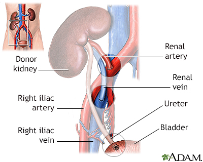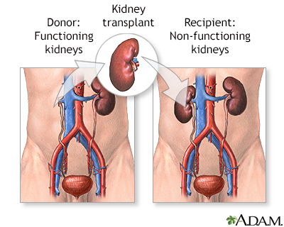 Renal transplant; Transplant - kidneyA kidney transplant is surgery to place a healthy kidney into a person with kidney failure.