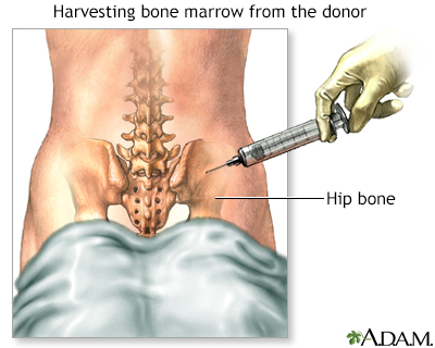 Bone marrow harvest -- This minor surgery is done under general anesthesia. This means the donor will be asleep and pain-free during the procedure. Some of the donor's bone marrow is removed from the back of both hip bones. The amount of marrow removed depends on the weight of the person who is receiving it. This method is rarely performed today.