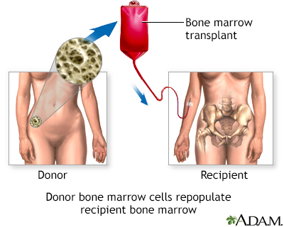 Transplant - bone marrow; Stem cell transplant; Hematopoietic stem cell transplant; Reduced intensity nonmyeloablative transplant; Mini transplant; Allogenic (or allogeneic) bone marrow transplant; Autologous bone marrow transplant; Umbilical cord blood transplant; Aplastic anemia - bone marrow transplant; Leukemia - bone marrow transplant; Lymphoma - bone marrow transplant; Multiple myeloma - bone marrow transplantA bone marrow transplant is a procedure to replace damaged or diseased bone marrow with healthy bone marrow stem cells.