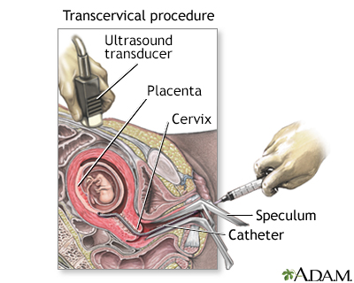 The transcervical procedure is performed by inserting a thin plastic tube through the vagina and cervix to reach the placenta. Your health care provider uses ultrasound images to help guide the tube into the best area for sampling. A small sample of chorionic villus (placental) tissue is then removed.