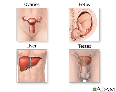 Cancer in testes, ovaries, biliary (liver secretion) tract, stomach, or pancreas