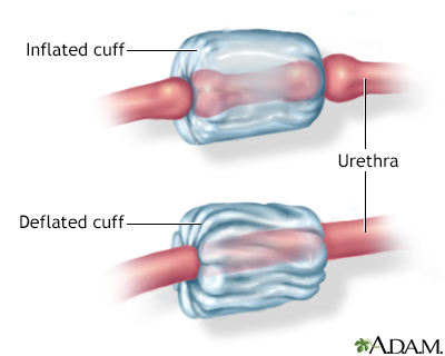 Artificial sphincter (AUS) - urinary; Inflatable artificial sphincterSphincters in the urinary system are muscles that allow your body to hold in urine. An inflatable artificial (man-made) sphincter is a medical device. This device keeps urine from leaking. It is used when your urinary sphincter no longer works well. When you need to urinate, the cuff of the artificial sphincter can be relaxed. This allows urine to flow out.