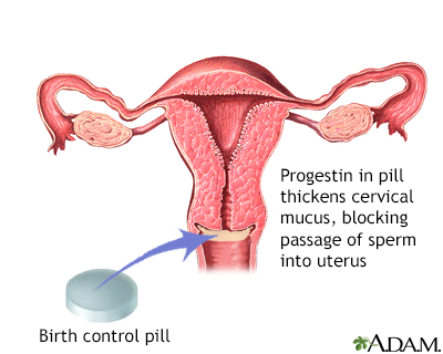 Progestins also make the mucus around a woman's cervix thick and sticky. This helps prevent sperm from entering the uterus.